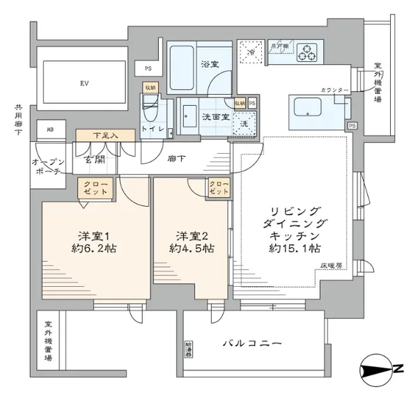 廊下に面する洋室1は約6.2帖の広さがあります。収納クローゼットを完備しているので、美しい状態の居室を保てそうです。リビングに隣接する洋室2は、趣味部屋や作業部屋としてもご活用いただけます。