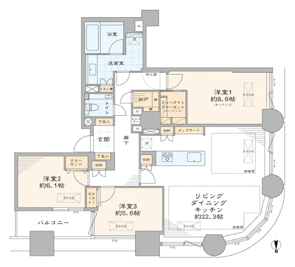 洋室1は約8.6帖の広さがあり、カーペットが敷かれているので冬でも快適に過ごせます。また、ウォークインクローゼットを備えているので、キャリーケースなど大きな荷物の収納にも便利です。洋室2と3は子ども部屋や作業部屋としてもご利用いただけます。