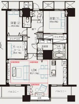 洋室1は約6.0帖の広さがあり主寝室に最適な広さ。マルチウォークインクローゼットを備えているので、洋服やバッグなど綺麗に収納できます。リビングに隣接するサービスルームは子どもの勉強部屋やワークスペースとして家族が共有して利用できそうです。