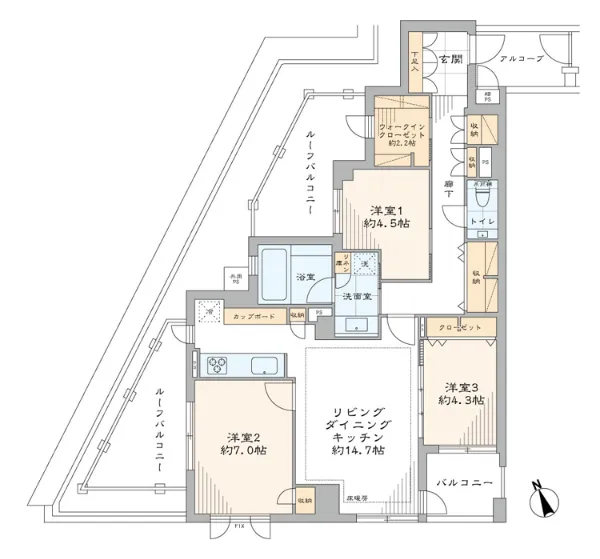 各居室はバルコニーに面しているので陽当たり通風良好です。リビングに隣接する洋室3は引き戸を開放すればより広い空間としてご利用いただけます。また、廊下にはウォークインクローゼットや収納クローゼットを完備しているので、物をしまい美しい状態を保てます。