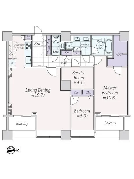 リビングから離れた約10.6帖の洋室は主寝室にも最適な広さです。大容量のウォークインクローゼットを備えており、長さのあるコートなど形を崩さず収納できます。約4.1帖のサービスルームは趣味部屋やワークスぺースなど集中して作業を行いたい時にも使えて便利です。