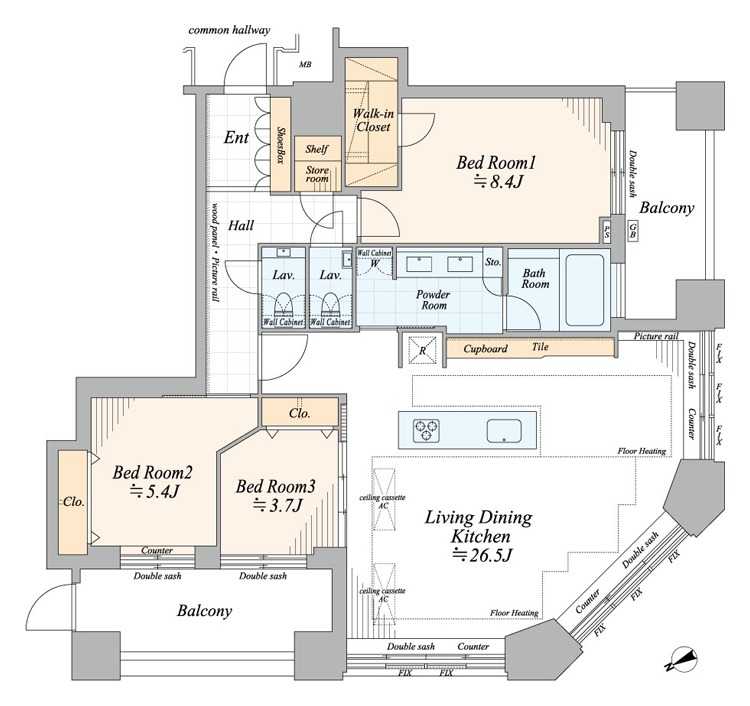 26.5帖の広々としたLDKは、窓面積が大きく光がたっぷり差し込み、室内を明るく彩ります。折り上げ天井が空間の広がりを演出し、床暖房が足元から暖かさを届けます。リビング・ダイニングとしての使い勝手も良く、家族やゲストと快適に過ごせる設計です。