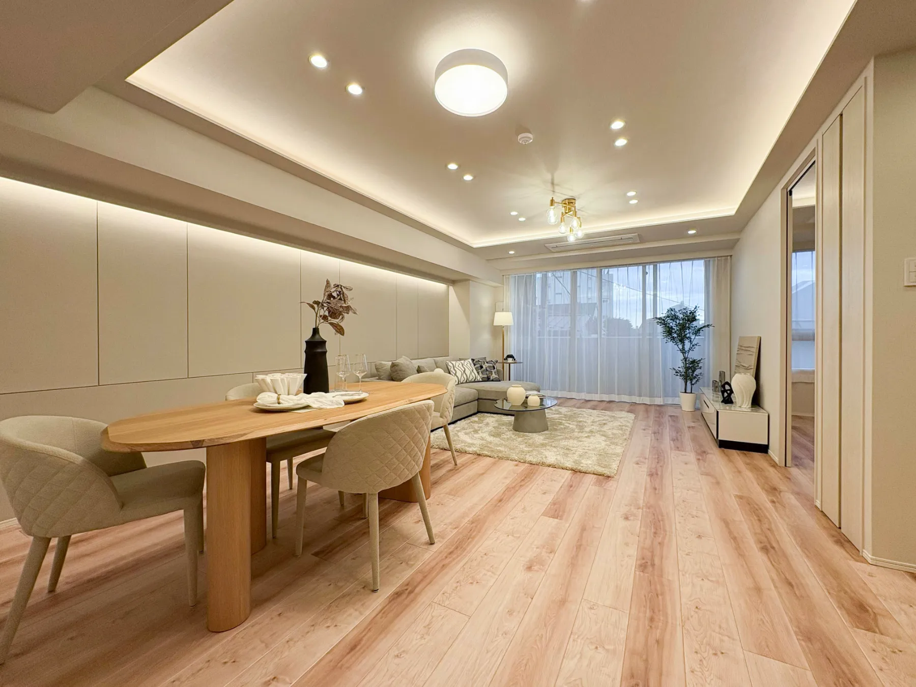 南向きのため陽当たりの良いLDKは22.5帖のゆとりある広さ。木の温もりあふれるフローリングが心地よい空間を演出し、折り上げ天井と間接照明が上質感と奥行きをもたらします。家族が自然と集まり、くつろぎの時間を穏やかに過ごせるリビングです。